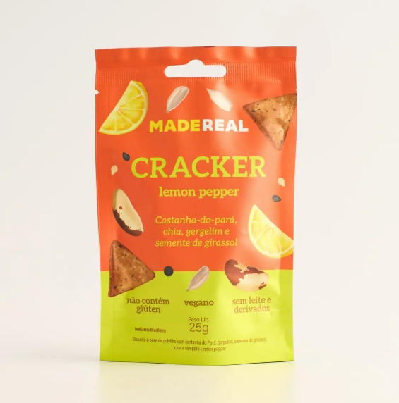 Achamos o snack para entrar no lugar daquele salgadinho todo cheio de conservantes! O cracker de lemon pepper da Made Real é ótimo para um lanchinho rápido, para matar uma fominha. A crocância da castanha-do-pará, gergelim e semente de girassol unida ao azedinho do limão com um leve toque de pimento do reino.