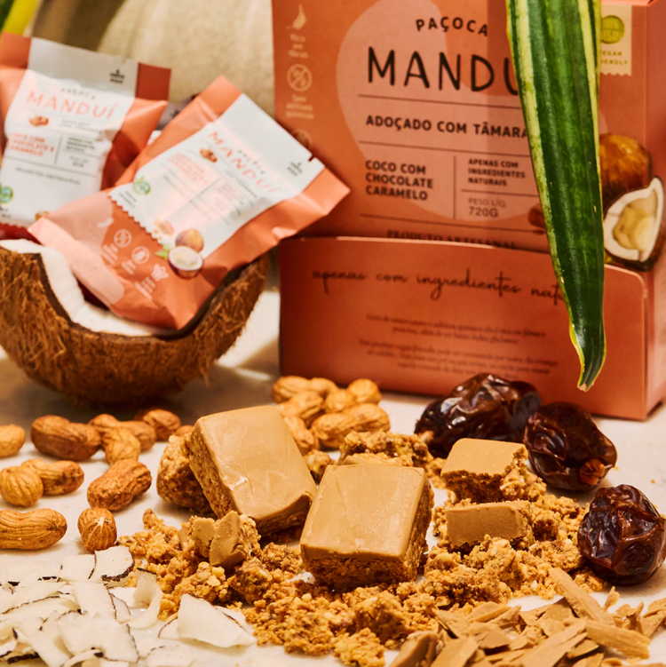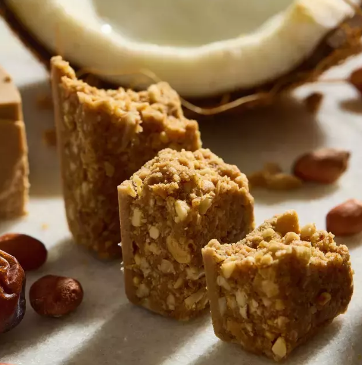 Ingredientes: pasta de amendoim, caramelo, farinha de amendoim, tâmara medjool, farinha de castanha de caju, xerém de amendoim, óleo de coco, açúcar de coco e flor de sal.